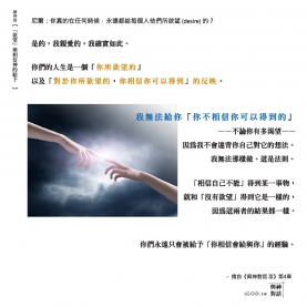 尼爾:你真的在任何時候,永遠都給每個人他們所欲望(desire)的?是的,我親愛的,我確實如此。你們的人生是一個「你所欲望的」以及「對於你所欲望的,你相信你可以得到」的反映。我無法給你「你不相信你可以得到的」——不論你有多渴望——因為我不會違背你自己對它的想法。我無法那樣做。這是法則...