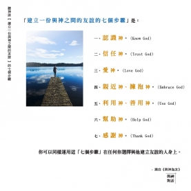 1、認識神。(Know God) 2、信任神。(Trust God)3、愛神。(Love God)4、親近神、擁抱神。(Embrace God)5、利用神、善用神。(Use God)6、幫助神。(Help God...