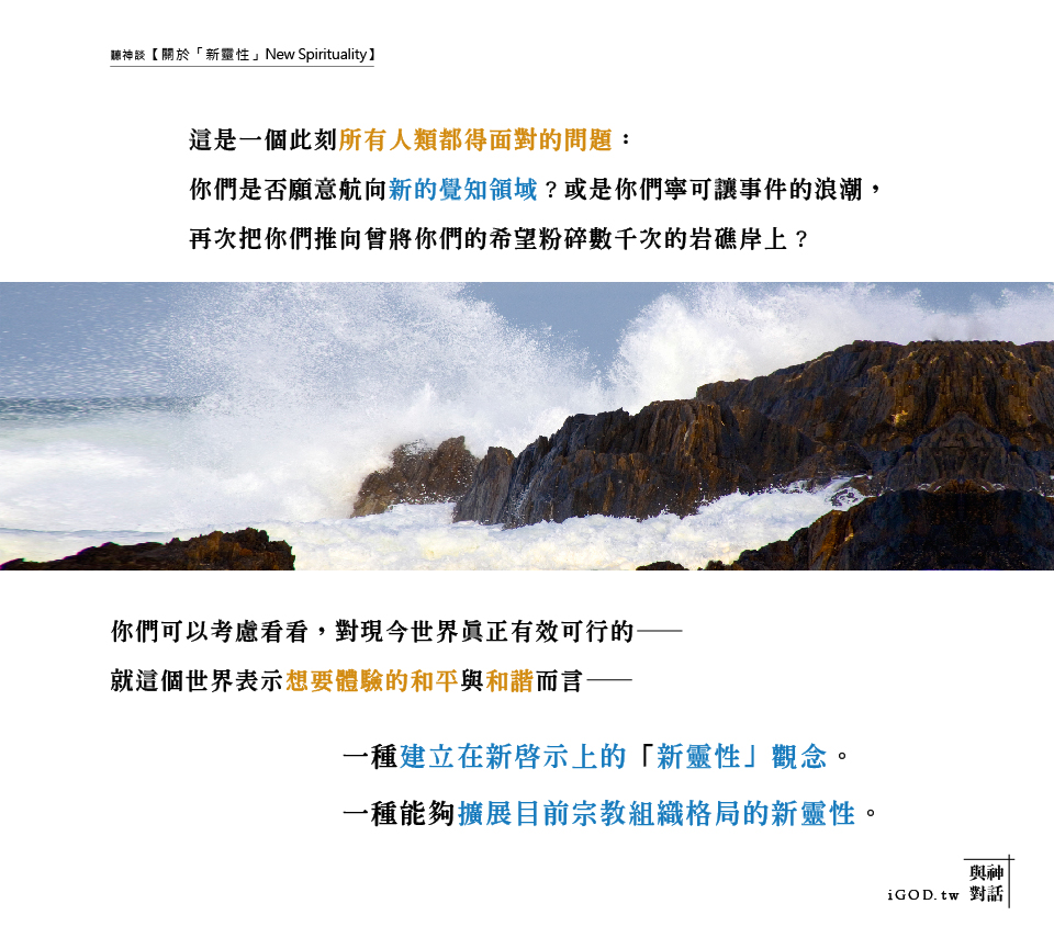 一種能夠擴展目前宗教組織格局的新靈性。因為正是許多傳統宗教的固有框架,阻礙了你們去體驗真正的神。