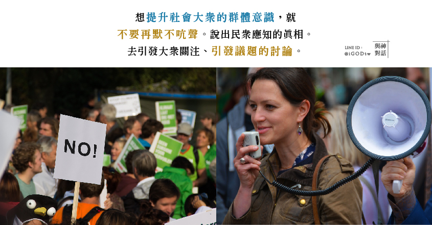 對於所有這些現象不要再默不吭聲。說出民眾應知的真相,引起關注性的騷動,引發議題的討論。你們甚至可以帶動一些集體意識的提升。