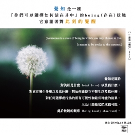 覺知是一種 「你們可以選擇如何活在其中」的 being( 存在) 狀態。它意謂著對 此刻的 覺醒。(Awareness is a state of being in which you may choose to live. It means to be awake to the moment.)...