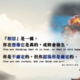 「相信」是一種心智的狀態(a state of mind)。在那狀態下我認為「我是確定的」,但事實並不一定是那樣。不是嗎?當人們正視和理解這點,並開始對自己在各種信念上產生更大畫面的覺察,即是一個很大的意識擴展。而意識的成長是人類所有的進步成長中,最珍貴、最偉大的成長。如果有機會「...