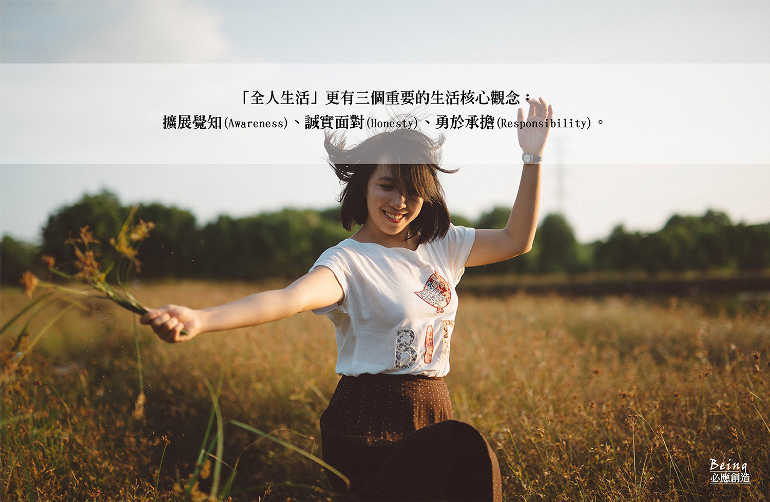 除了以三面向健全且並重地過生活外,「全人生活」更以三個重要的生活核心觀念:擴展覺知(Awareness)、誠實面對(Honesty)、勇於承擔(Responsibility)在每天的生活中,經常提醒自己去觀察和思考(覺察和反省)「我是誰」和「什麼才是我要成為的我真正是誰」。