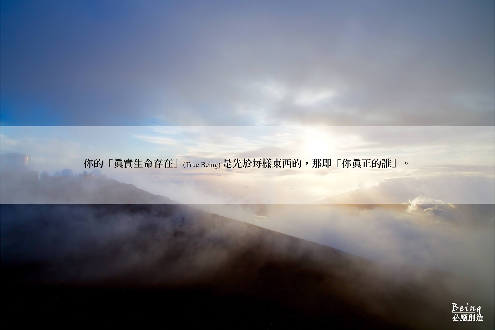 你的「真實生命存在」是先於每樣東西的,那即「你真正的誰」。當你在思考你現在希望是誰時,你是進入你的「真實生命存在」,搆到了你「完整的自己」 (Total Self),而聚焦在你現在希望去經驗之你「完整的自己」的一部分上。 (When you think about who you now wish to be, you are reaching into your True Being, into your Total Self, and focusing on a part of your Total Self that you now wish to experience.)