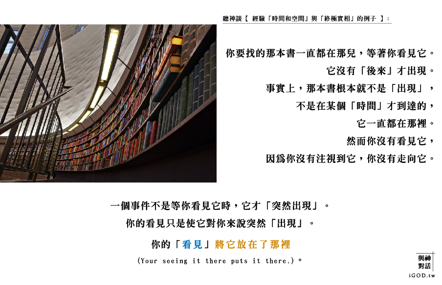 你要找的那本書一直都在那兒,等著你看見它。它沒有「後來」才出現。事實上,那本書根本就不是「出現」,不是在某個「時間」才到達的,它一直都在那裡。然而你沒有看見它,因為你沒有注視到它,你沒有走向它。