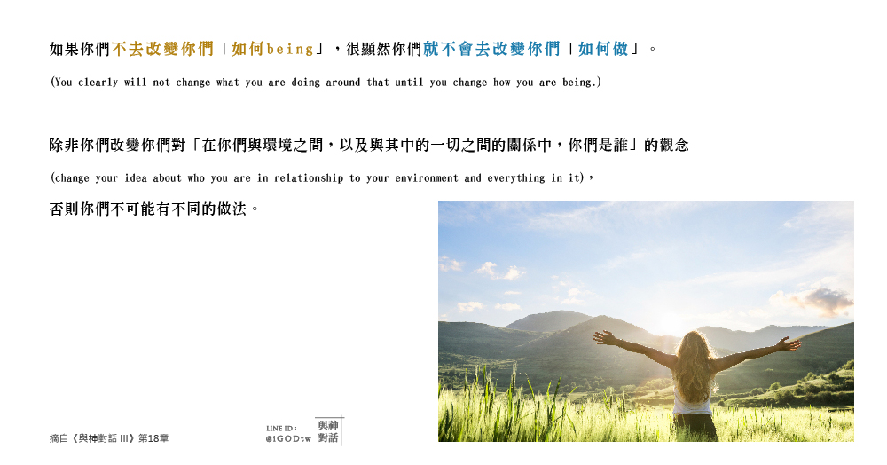 長久以來人類一直都在「做」的層次試圖想解決問題,卻不怎麼成功。這是因為:真正的改變永遠是從「being」的層面,而非從「做」的層面被達成的。(That's because true change is always made at the level of "being", not "doing". 註:神的意思是,從「做」的層面只能達到一時的改變,那並非真正的改變 true chenge。但是許多人認為那是真的改變。)
