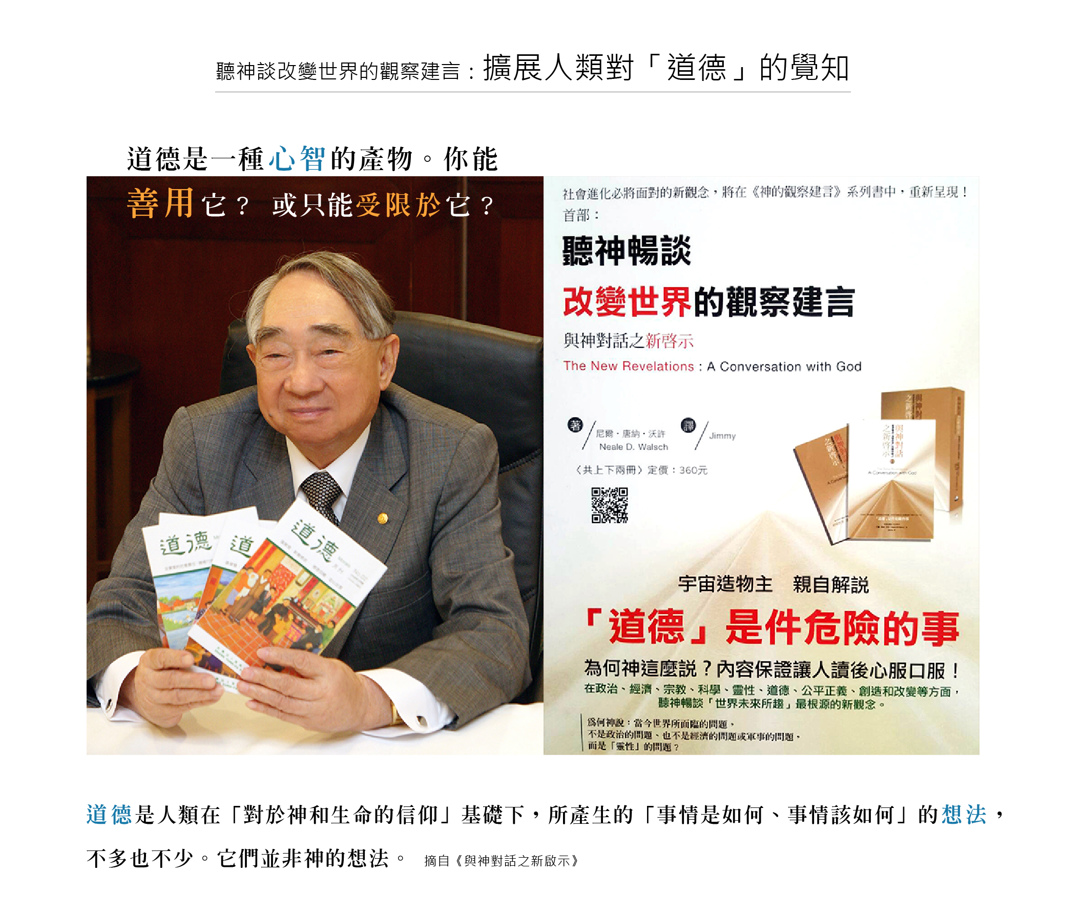很少人能夠像張榮發先生一樣地善用了道德的力量在自己和周遭的人身上,為社會帶來一分安定的力量,值得敬佩(張榮發先生自2008年起創辦了《道德月刊》)。然而,因道德的約束(由外向內)而安定,與因覺知的擴展(由內心自由意志的選擇)而安定,兩者在意識和演化的進展上有很大的差異。您能看出這差異嗎?何者是較文明進化的跡象?