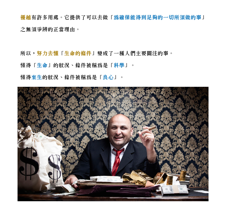 所以,努力去懂「生命的條件」變成了一種人們主要關注的事。懂得生命的狀況、條件被稱為「科學」。懂得來生的狀況、條件被稱為「良心」。如果一個人懂得這些狀況、條件,並且了解它們,便會被稱為是有一種「好的良知」或是有「意識」。