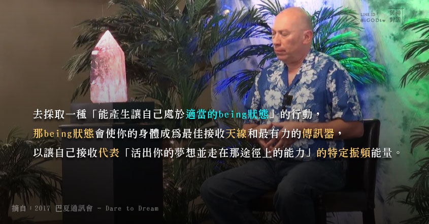 去採取一種「能產生讓自己處於適當的being狀態」的行動,那being狀態會使你的身體成為最佳接收天線和最有力的傳訊器,以讓自己接收代表「活出你的夢想並走上那途徑的能力」的特定振頻能量——你生活中需要接收的振頻能量。