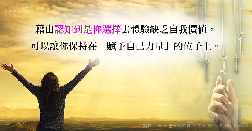因為藉由認知到是你(在另一意識層面)選擇去「體驗缺乏自我價值」,可以再次地讓你保持在「賦於自己力量」的位子上,