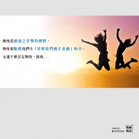 熱忱是將being(所處狀態)轉成行動的愛。(Passion is the love of turning being into action.)。它是創造之引擎的燃料(It fuels the engine of creation.)它將觀念變成了經驗...