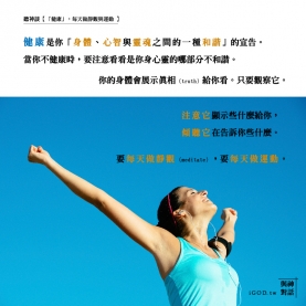 健康是你「身體、心智與靈魂之間的一種和諧」的宣告。當你不健康時,要注意看看是你身心靈的哪部分不和諧。也許是該讓你的身體休息的時候了,但你的心智卻不知道該怎麼做。也許是你的心思長期駐在一些負面的、憤怒的思維裡,或總是為明日在擔憂,而讓你的身體無法放鬆...