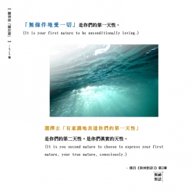 「無條件地愛一切」是你們的第一天性。(It is your first nature to be unconditionally loving.)選擇去「有意識地表達你們的第一天性」是你們的第二天性,是你們真實的天性。(It is you second nature to choose to...