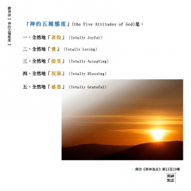 「神的五種態度」(the Five Attitudes of God)是:一、全然地「喜悅」。(Totally Joyful.)二、全然地「愛」(Totally Loving)三、全然地「接受」(Totally Accepting...