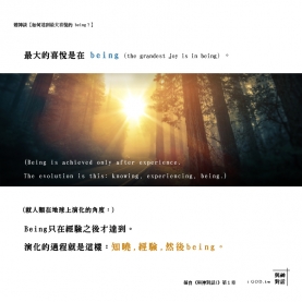 最大的喜悅是在being(the grandest joy is in being.)Being只在經驗之後才達到。演化的過程就是這樣:知曉,經驗,然後being。(Being is achieved only after experience.The evolution is this:...