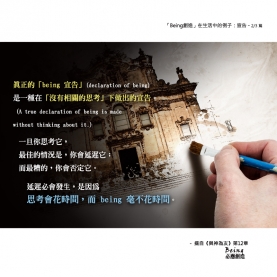 真正的「 being 宣告」是一種在「沒有相關的思考」下做出的宣告。一旦你思考它,最佳的情況是,你延遲了它;而最糟的,你否定了它。 (A true declaration of being is made without thinking about it. If you think about...