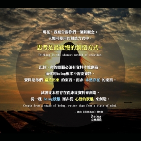 現在,我要告訴你們一個新觀念:思考是最緩慢的創造方式。Thinking is the slowest method of creation. 記住,你的頭腦必須有資料才能創造,而你的being根本不需要資料。資料是你們編造出來的東西,而非本然存在的東西...